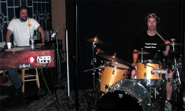 we had originally been scheduled to start the recording a week before but mike had taken a nasty tumble on his bike and hurt his forearm and jer was being plagued by a flu virus. we had been going over the material for the last couple of weeks and it was slow going as mike was really hurting and the songs weren't coming to me and jer too easily, but we had it along sufficient enough to start laying down tracks and we had to get a move on as we have gigs and a tour coming up. we got down to the studio (Karma, in pedro) and start setting up the gear- mike wants to keep the drums isolated so we take some time isolating our own equipment so there's no bleed-thru on the drum mics. Mike had rented some nice tube mics for overheads but they were not a matched stereo pair and the levels were way off. Michael, the knob man, makes a few calls to the rental place to score some reeps but it's NAMM show weekend in LA and there's nary a soul to be found that isn't in attendance. we decide that we'll start laying tracks the next day so we spend the rest of the day just getting good sounds in preparation for the recording. Jer borrowed a real nice kick from a friend and it's got a good woof to it - mike's recording w/ his tele' bass while I'm using my road B3 w/ a modified 145 Leslie (michael miked it up w/ 2 C414's on the top and a neumann U47 on the bottom ). After we had finished up tweaking the sounds as best we could, Jer gave me a ride to my DUI class and dropped off tom at my pad. Not an extremely productive day but that's how the cards fall sometimes. saturday, the real fun would start.