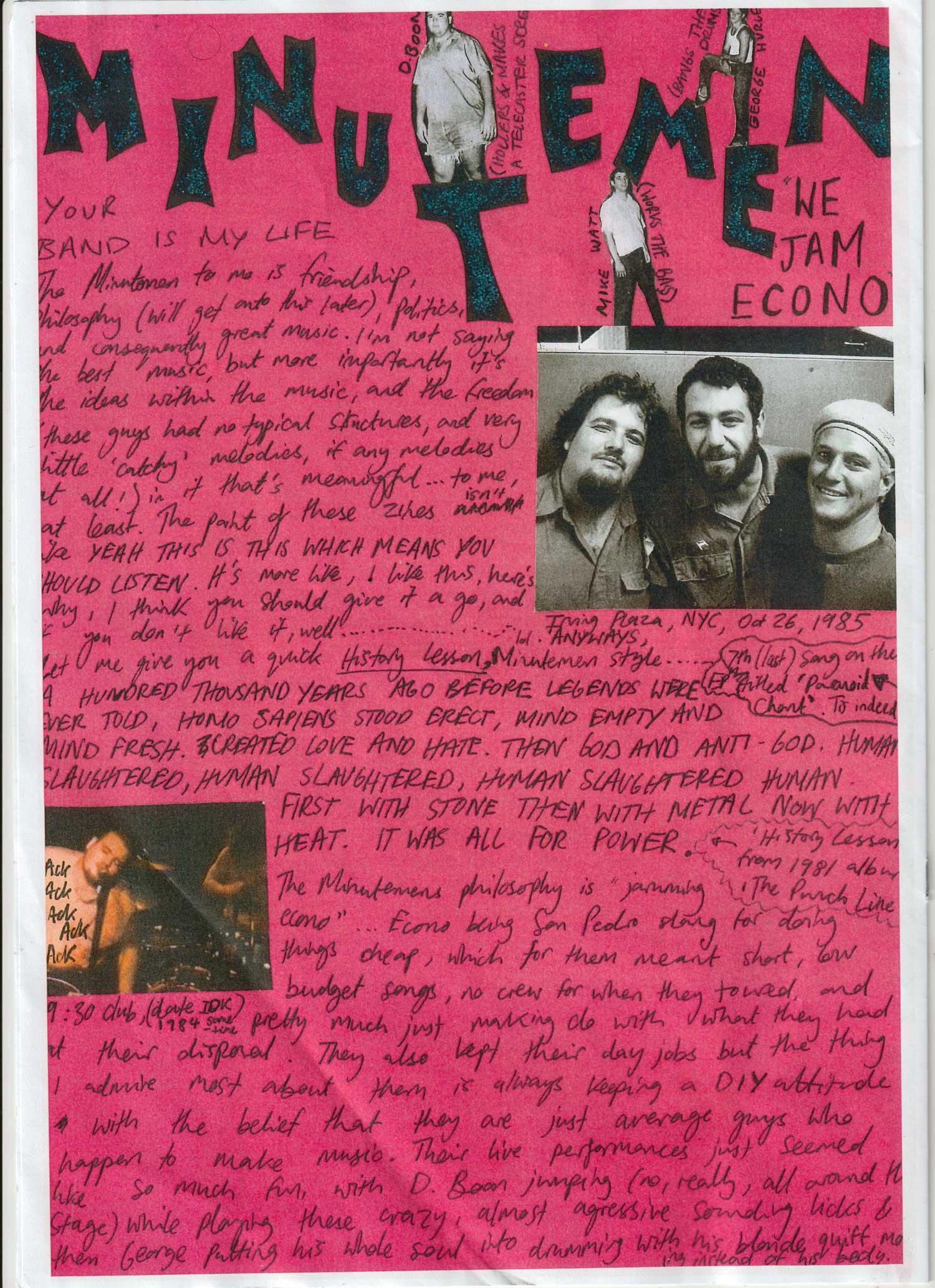 so lucky, I also get not just an "alber ayler" (meaning aisle seat) but the two seats next me are empty which is way happening, one reason's cuz the oblivious cabron in front of me keeps kicking back and laying his set all over my shit but I can at least turn kind of sideways to alleviate some of that bogart fucking rude... I ain't gonna let it get to me, let it ruin the good feelings I really had about this tour. I got hodge in the seat behind me and I keep me seat in the upright position the whole ten and a half hour flight, love hodge. I read that "gracious great pree tree" fanzine I got in london - man, is it fucking happening, love it! makes me remember zines helping me w/being so excited about the movement in the old days, people sharing the fires they got burning for music and culture in what I call "the walt whitman tradition" - doing it yourself and letting the freak flag fly, no mersh shit. man, reading this makes this fucking hikoki ('plane' in jap) hellride worth it - man, I wish I knew who to thank w/an email... there's a handwritten "copy for mike watt... thank you for everything" spiel on the cover and better than that, a fuckin piece on the minutemen - yes! (here's scans of bof page of it: one and two) but I can't find any contact info, crimony! I gotta get on the case w/this mystery, huh? yep.