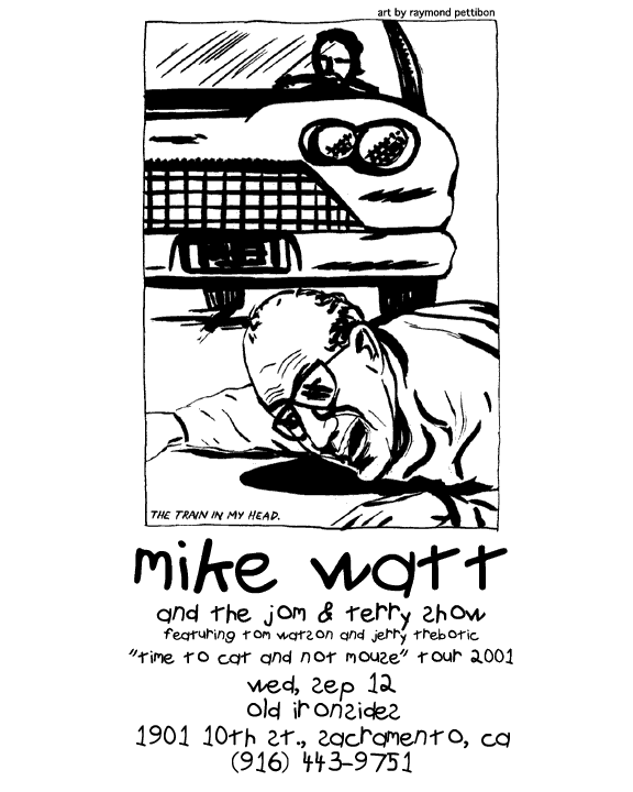 time to get back to some watt-oriented trio playing. it was excellent and quite an opportunity to play w/mr. j mascis and mr. george berz since last oct and I both learned and experienced much but now it's time to kick out some thuds from my perspective. hence the name, "time to cat and not mouse." now, I believe it's very healthy and a necessary duty to mouse from time to time but other moments call for some straight up cattin'. w/me this fall will be pair of pliers alumnus. mr. tom watson on guitar and madonnabes stick man, mr. jerry trebotic who'll both make up "the jom & terry show" and wear the stage names jom tatson and terry t rebotic heroically. we're doing some trippy choices different from the last tours I've previously done. it's all a warm-up to get my finger playing stuff back after all that pick action w/the fog this last year. should be a hoot. I look forward to bringing this three-way watt wrestlin' weirdage your way soon.