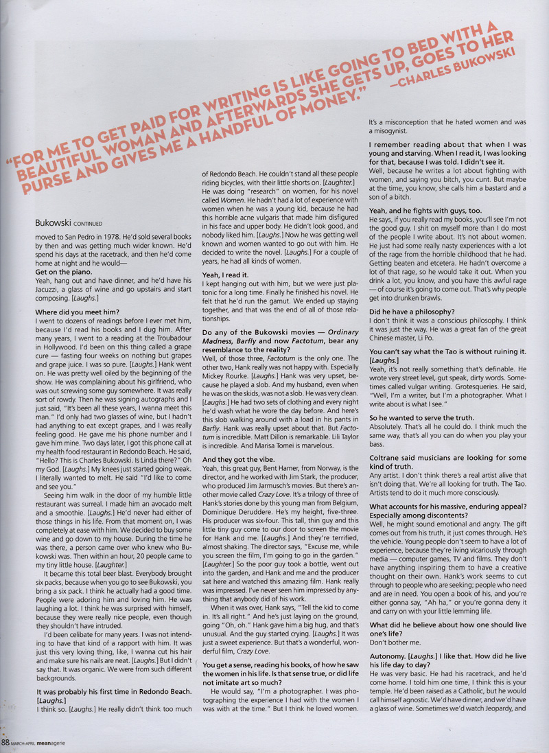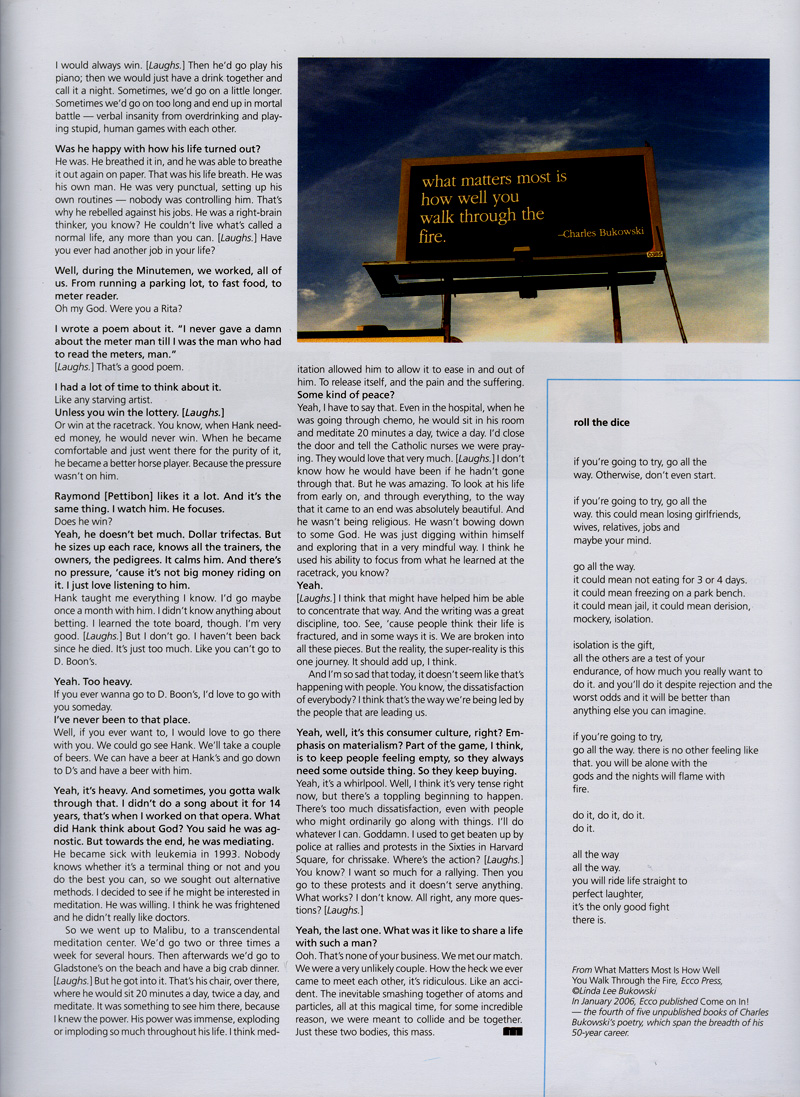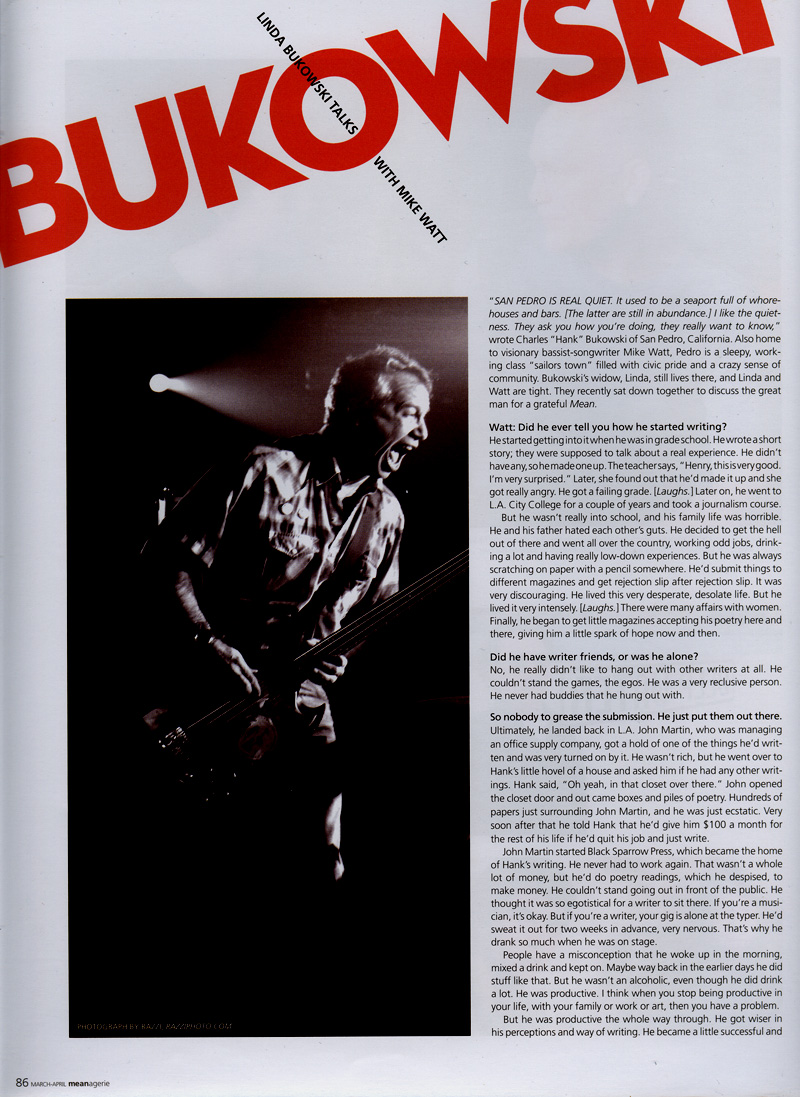 [here's the unedited version of the interview Mike Watt did of Linda Bukowski for "MEAN" magazine's March-April 2006 Volume 2, Issue 7 - to read what got acutally got printed, click on the four above pictures]